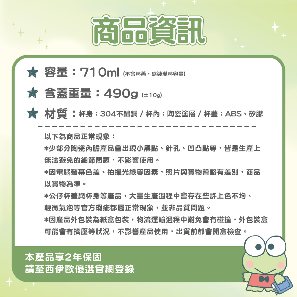 保溫杯身在正常使用下,不鏽鋼本體真空保溫杯(保冷)功能失效提供保固兩年換貨服務,不包含零件耗損與自行改裝或任何意外(包括人為過失或天災地變等不可抗拒之外力)造成的損害故障,因個人使用造成之損害,恕無提供維修服務及保固。